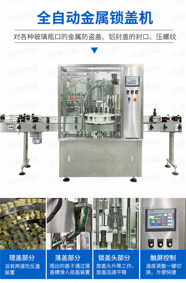 本設備適用于食品、化妝品、化工等行業,主要針對各種玻璃瓶口的金屬防盜蓋鋁封蓋的封口、壓螺紋等。該設備可單機使用,也可以與灌裝機等設備組成生產流水線自動作業;
