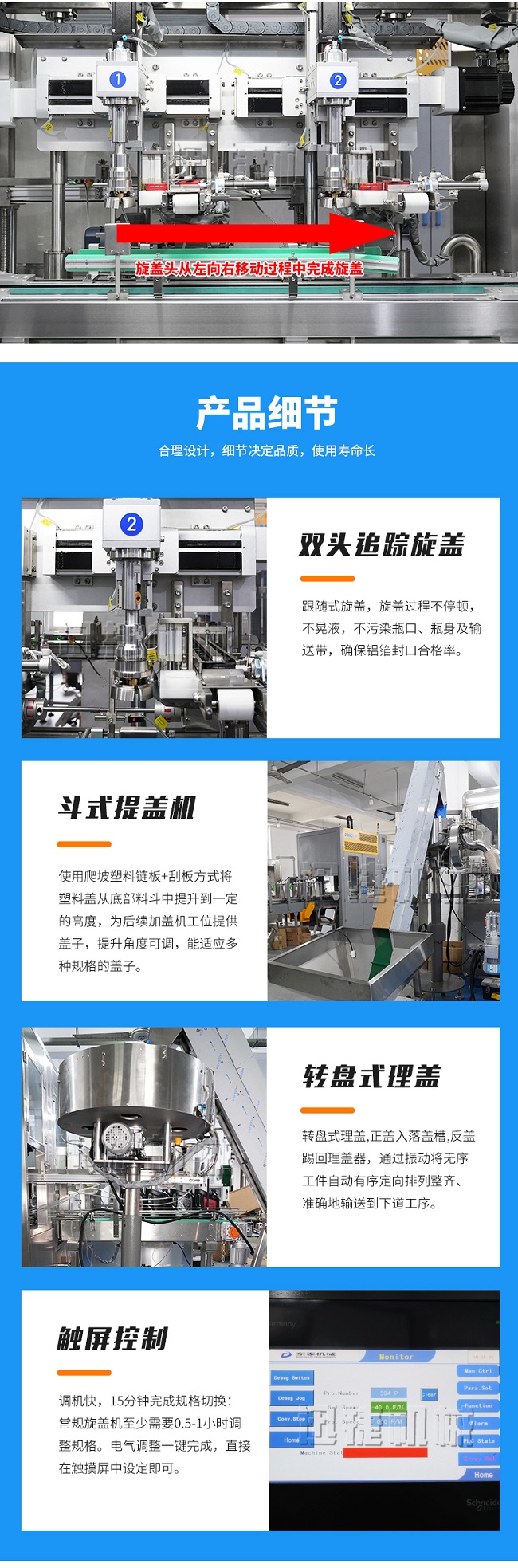 2、品質(zhì)高:跟隨式旋蓋,旋蓋過程不停頓,不晃液,不污染瓶口、瓶身及輸送帶,確
