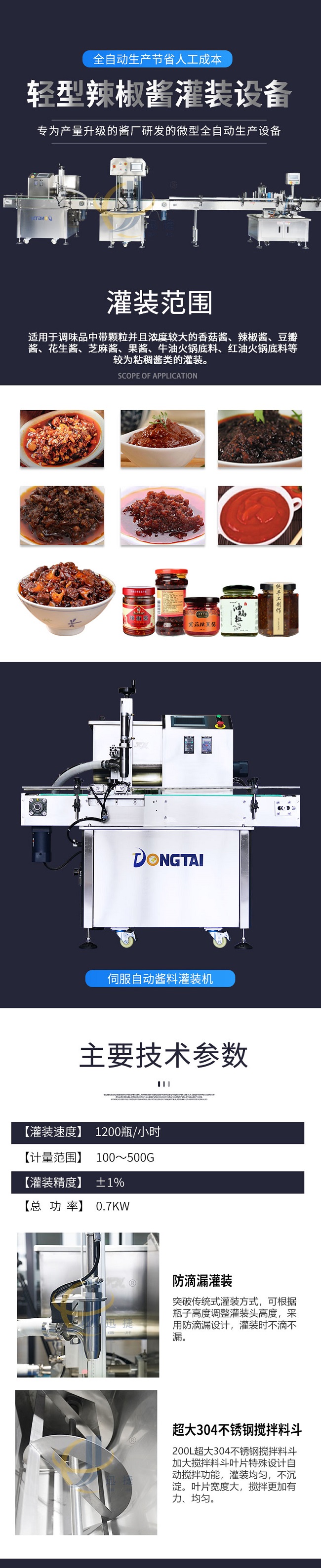 這款小型辣椒醬灌裝生產(chǎn)線是本公司專為產(chǎn)量升級的醬廠研發(fā)的微型全自動(dòng)生產(chǎn)設(shè)備,適用于調(diào)味品中帶顆粒并且濃度較大的香菇醬、辣椒醬、豆瓣醬、花生醬、芝麻醬、果醬、牛油火鍋底料、紅油火鍋底料等較為粘稠醬類的灌裝。