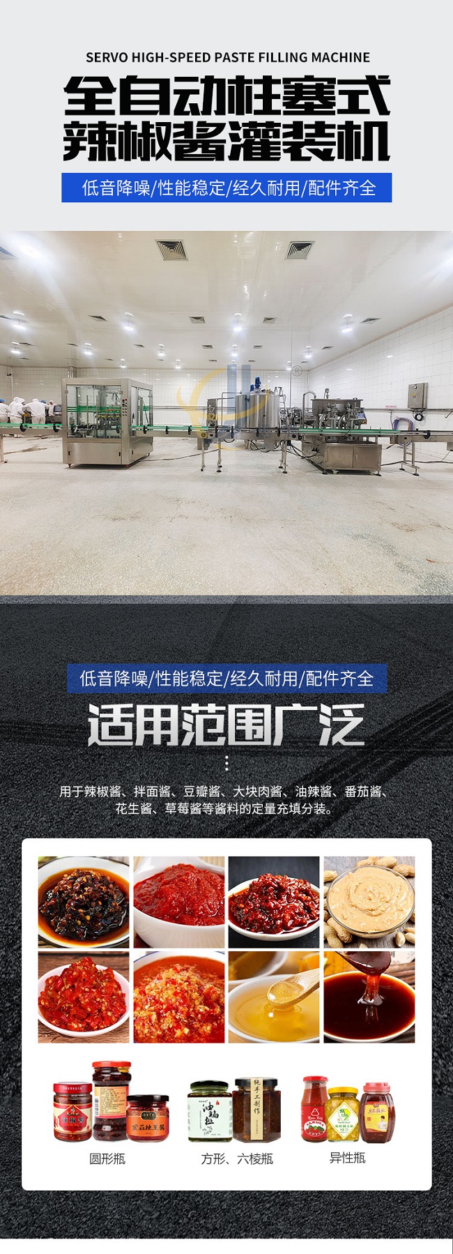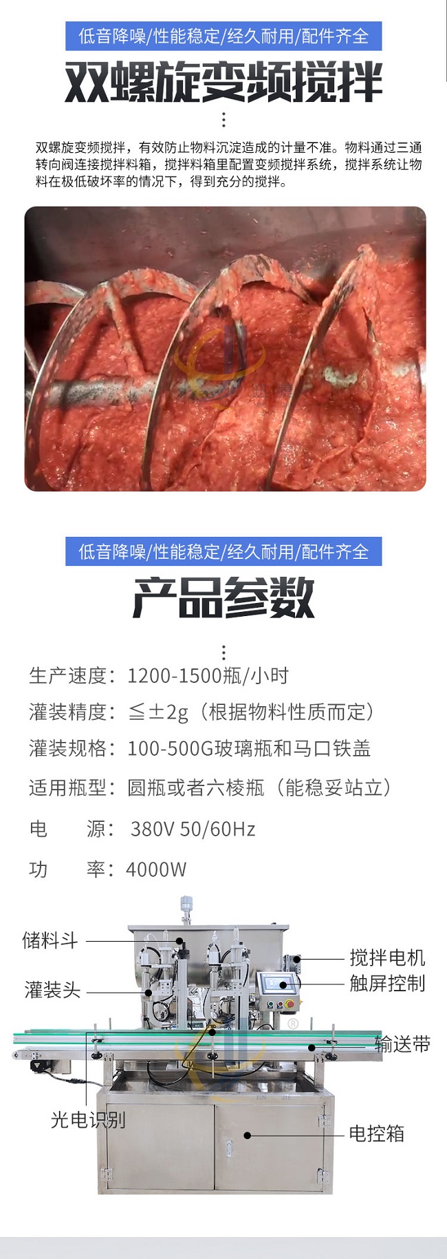 這款柱塞式辣椒醬灌裝機低音降噪、性能穩定、經久耐用、配件齊全,適用范圍廣泛用于辣椒醬、拌面醬、豆瓣醬、大塊肉醬、油辣醬、番茄醬花生醬、草莓醬等醬料的定量充填分裝。雙螺旋變頻攪拌,有效防止物料沉淀造成的計量不準。物料通過三通轉向閥連接攪拌料箱,攪拌料箱里配置變頻攪拌系統,攪拌系統讓物料在極低破壞率的情況下,得到充分的攪拌。