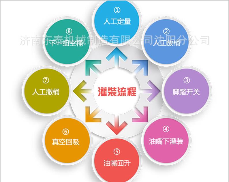 小型食用油灌裝機:一般都帶有腳踏開關,人工定量(不換規格只需一次)→人工放桶→腳踩啟動→油嘴下落→灌裝→油嘴回升→真空回吸→人工撤桶(可配合后段輸送線直接放置傳送帶上)→人工放下一組空桶。半自動灌裝機分單頭和雙頭,單頭灌裝能力120桶/小時(按5升計算)。雙頭小包裝灌裝能力:360桶/小時(按5升計算)。